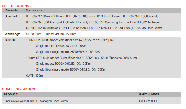 SW-FGM-08SFP is a nine ports Gigabit fiber switch, with 8 1000M SFP fiber ports and 1 1000M Combo port (100M / 1000M SFP port or 10/100/1000M R.J45 port optional) uplink. SW-FGM-08SFP supports SFP modules hot plug, and supports to work with other fiber switches, fiber converters and other devices with fiber ports. support WEB management and SNMP management (optional); support to transmit HD video flow;streamlined network structure(equal to 8 units fiber media converter and an Ethernet switch ), apply to security system, electronic power system and traflic system requirements.