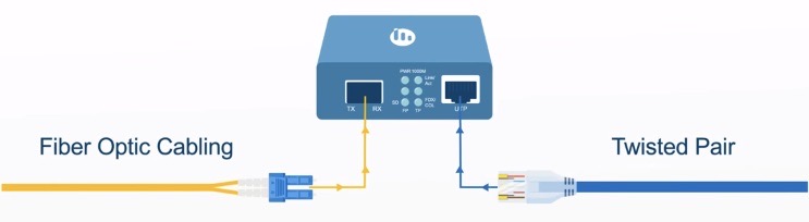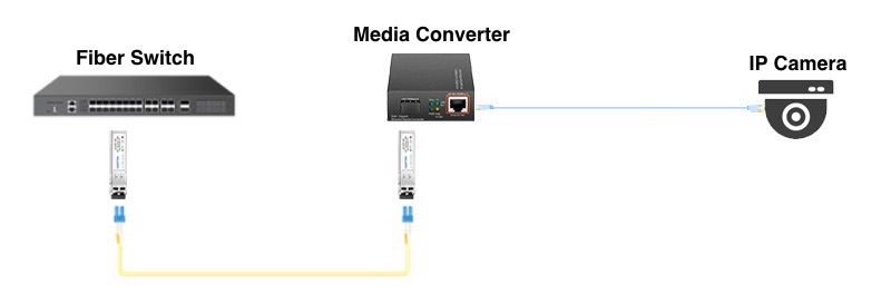 Media Converter ที่ต้นทางจะทำหน้าที่แปลงสัญญาณข้อมูลจากกล้อง IP Camera จากรูปแบบสัญญาณไฟฟ้าให้เป็นสัญญาณแสง (Optical Signals) และส่งไปผ่านทางสายไฟเบอร์ออปติก เมื่อสัญญาณไปถึงตัวแปลงสัญญาณที่อยู่ปลายทาง ข้อมูลก็จะถูกแปลงกลับมาให้เป็นสัญญาณไฟฟ้าอีกครั้งหนึ่ง และถูกส่งต่อไปผ่านสายแลน